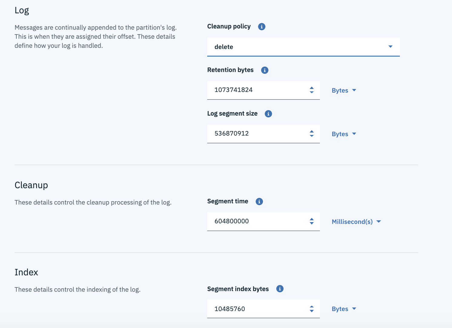 • Retention time: This is how long messages are retained before they are deleted to free up space. If your messages are not read by a consumer within this time, they will be missed. It is mapped to the retention.ms kafka topic configuration.