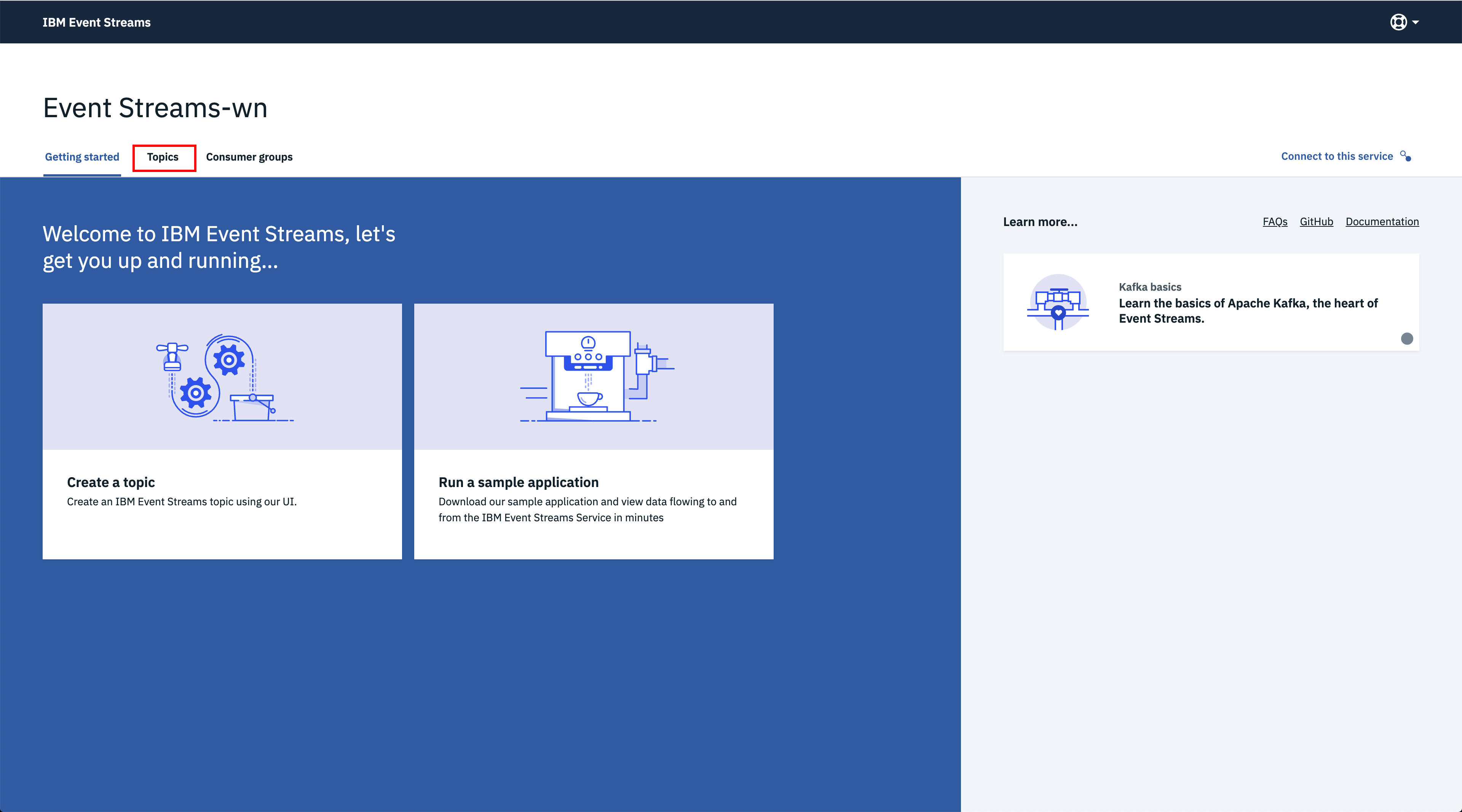 1. Open the IBM Event Streams user interface (go into your IBM Event Streams service within your IBM Cloud portal and click on the launch dashboard button). Once there, click on the Topics tab from the top menu: